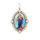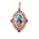 Pendente in oro 9kt con gancio apribile in 18kt con giro di zaffiri gialli e quattro rubini taglio carrè ai quattro punti cardinali. Misure e materiali: 34x21cm, oro 9kt/oro 18kt, zaffiri gialli 0.55, rubini 0,75ct.