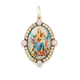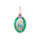 Pendente in oro 9kt con gancio apribile in 18kt con giro di zaffiri gialli e quattro rubini taglio carrè ai quattro punti cardinali. Misure e materiali: 34x21cm, oro 9kt/oro 18kt, zaffiri gialli 0.55ct e rubini 0,75ct.